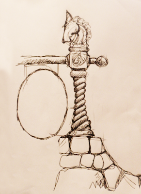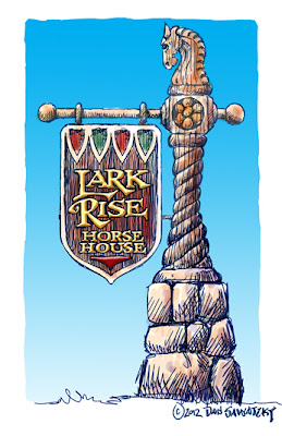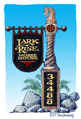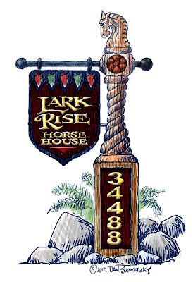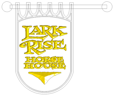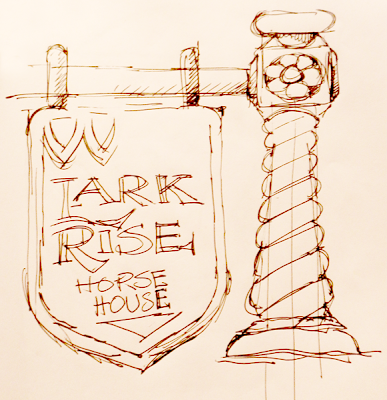 One of our current projects is one that will use pretty much every feature and technique we can muster including the four axis capabilities of the MultiCam. Textures, bevels, layers, fancy turning, indexing, and plenty of bits and pieces and lots more are used on the sign. Our client owns a small acreage, with buildings that evoke a Hobbit feel. They also liked old English pubs. They had named their property Lark Rise Horse House. Obviously a horse theme was needed. My first sketches nailed the basic concept.