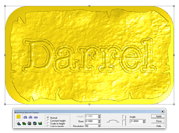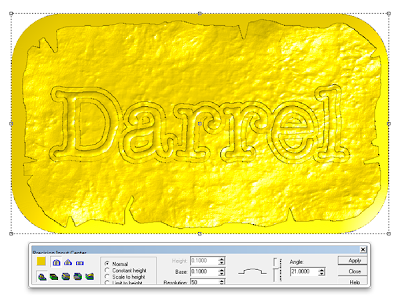 I then imported the bitmap I had created and applied it to the relief. In the screen capture below the name and outline is selected as well as the plate and newspaper outline. It shouldn’t be selected so if you are repeating this exercise make sure you don’t do as in the picture.
