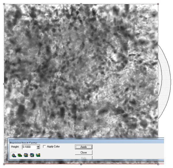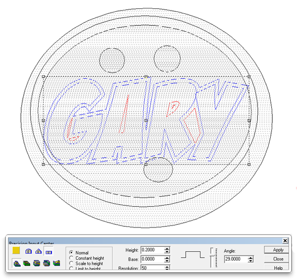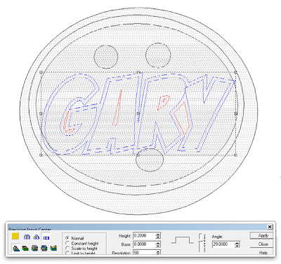 The letter outline was created as a flat relief that was .75 inches tall. Then I used the same oval vector that I had used to hump up the spaghetti and meatballs (and the same value in the input box) to dome up the lettering outline.