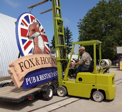 After waiting almost twelve weeks for a permit to install the Fox and Hounds Pub sign it is at last time to do the install. Todays task was to first build a giant easel on the flat bed trailer. We used welded steel for maximum strength.