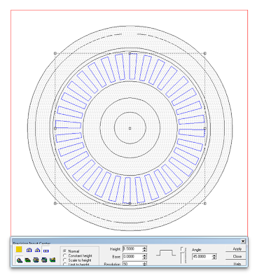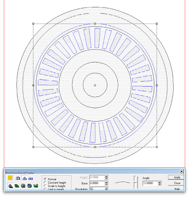 I then raised the teeth of the gears as a flat relief. I used the circle vector around the teeth relief to modify then using the bevel tool. this angled them upwards in the middle. Then I went to the front view and nudged them up into position vertically.