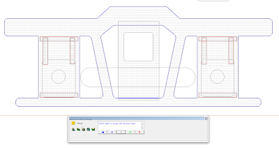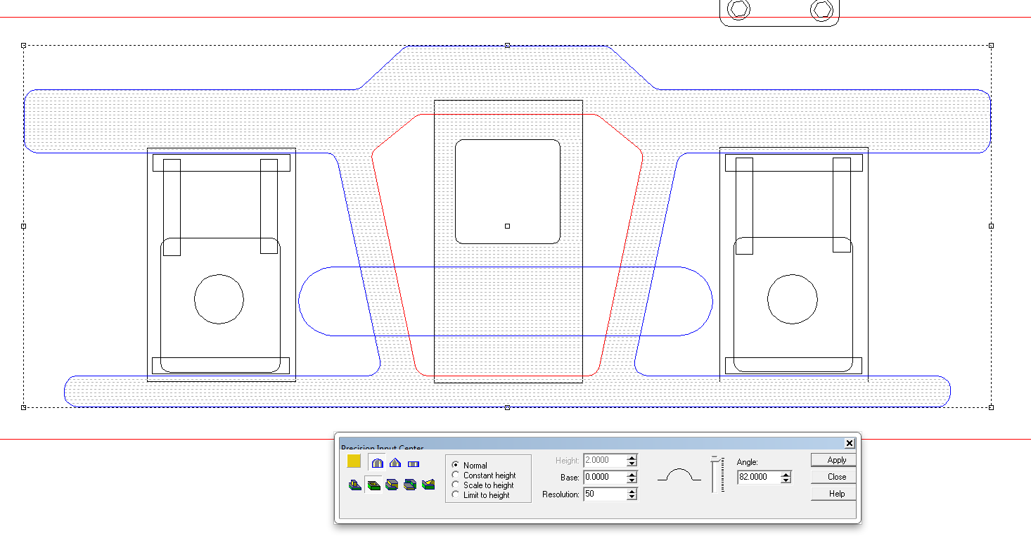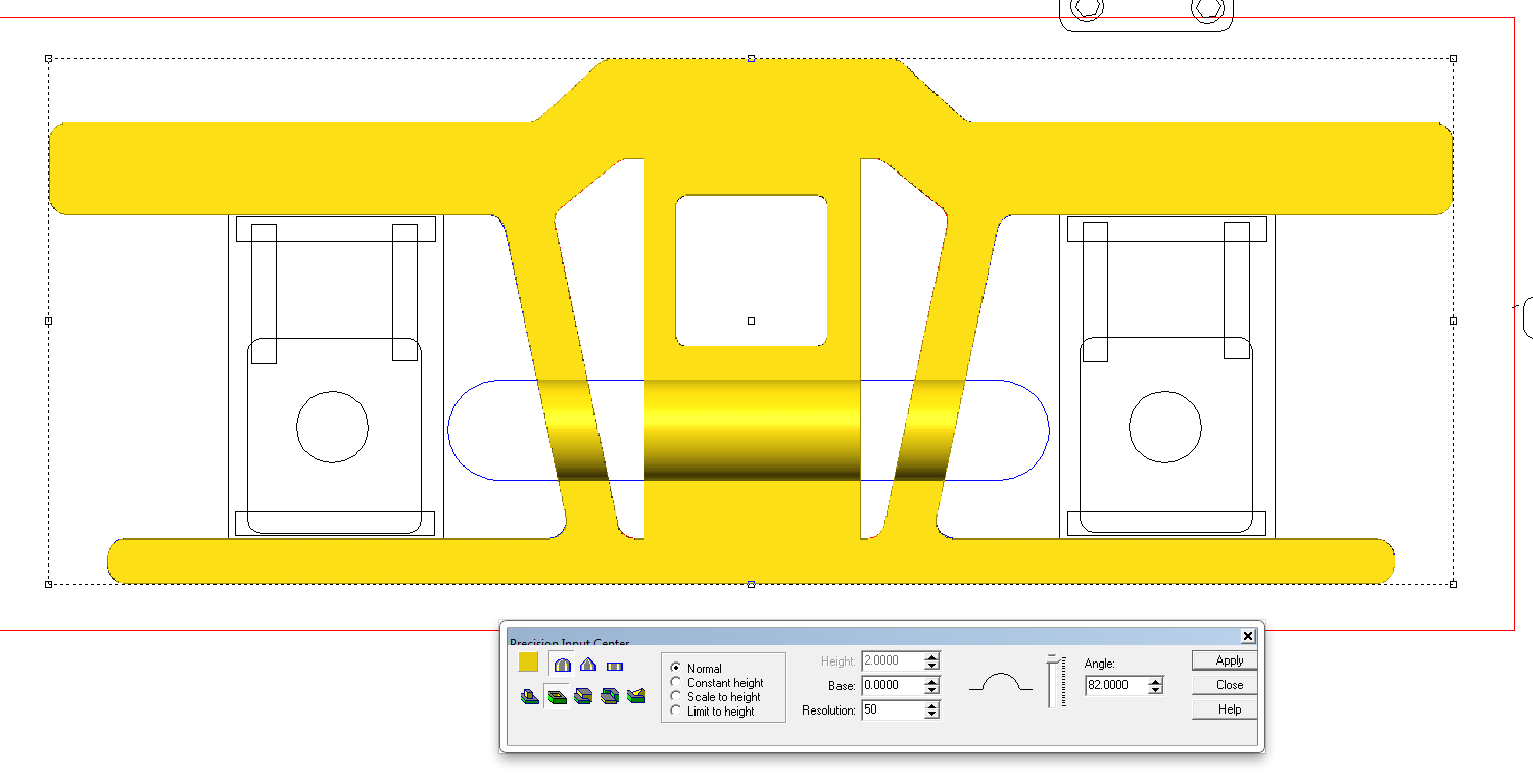 Todays build is the truck for the locomotive. This is a heavy cast frame that holds the wheel sets in alignment and supports the locomotive. I started by building the vector in EnRoute pro. The frame vector was selected and a flat relief 2″ tall was created.