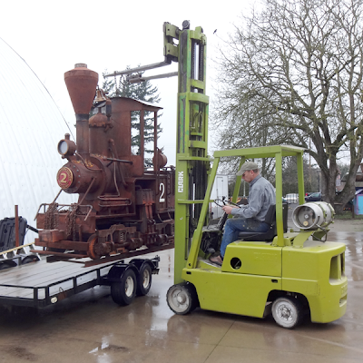 The last step of amy project is to ready it for shipping. In this case we get to have the fun of delivering it ourselves. The train weighed in at 1,664 lbs. I had built a sturdy lift point into the roof of the cab on the steam engine. It was a simple matter of threading through a small chain and then using the forklift to haul it over to the trailer.