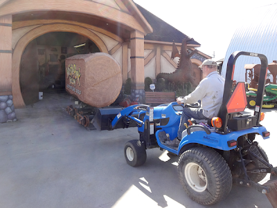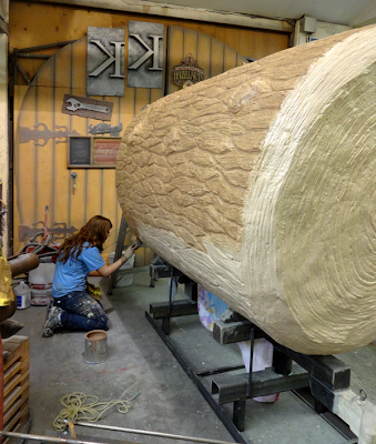 I posted pictures and a small writeup of the log car that would accompany the steam locomotive on the Whistle Punk Hollow Adventure Golf project. That article covered creating and routing the face of the log which would act as a giant sign. Around that we welded up a framework of quarter inch thick steel bar, then attached expanded lath to that framework. Over this we troweled on a thick coat of fibreglass reinforced concrete and then as it dried carved in the woodgrain and bark textures. This was allowed to cure for a few days.