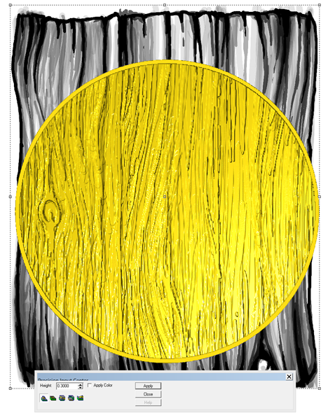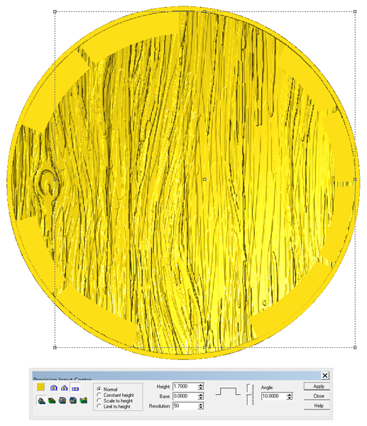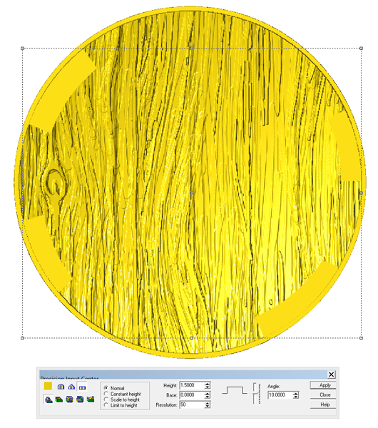 I then modified this relief by adding a shallow dome to the centre portion (not shown) and then modified the relief once more by adding a bitmap woodgrain.