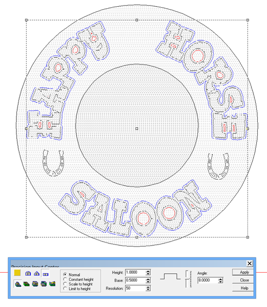 I then added a 0.3″ border around the letters. I would use this later. The center circle was made into a 2″ tall flat relief. This is the thickness of 30lb Precision Board I will route the piece out of. The round barrel head will fasten to this circle.