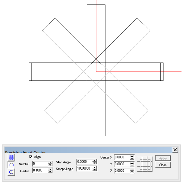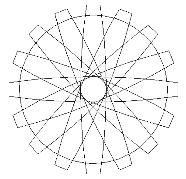 The inside spokes used some of the same methods. Creating multiple copies using the array tool I used a value of 180 degrees. This created one extra copy of the rectangle but rather than do the math tp calculate the angle I needed to start and finish it was simpler to just delete the extra rectangle and then centre all the pieces in relation to each other.