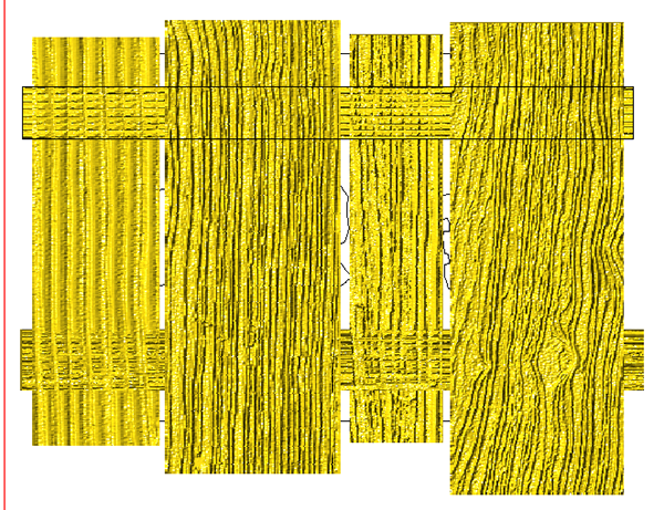 I then imported the sandblasted wood bitmap. This bitmap is based on an actual photo of five laminated boards. I positioned the four rectangular reliefs over the boards sizing them to fit on the different pattern boards, assigned a value of 0.15″ and added the textures.