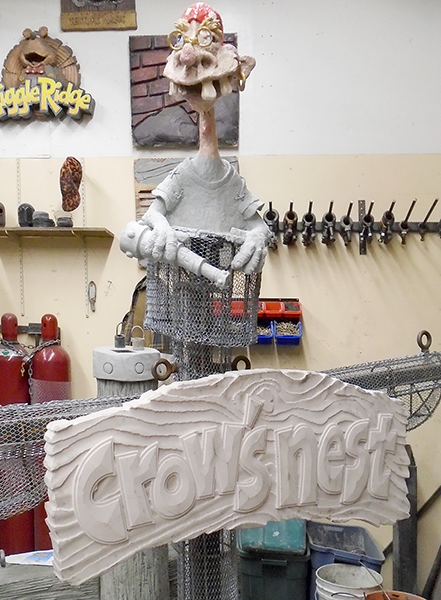The routed portion of the Crow’s Nest sign was only the start. Specs would be perched in the crows nest on the top of the mast and support structure. Peter had great fun doing the sculpt.