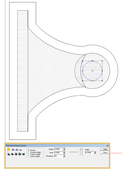 At this point I changed my mind and decided that the top (big) flat side of the bracket needed to be as deep as the round collar at the bottom. To do this I created a rectangle of appropriate size. I positioned the rectangle vector and used the jigsaw tool to again define the dropped portion (not shown.)