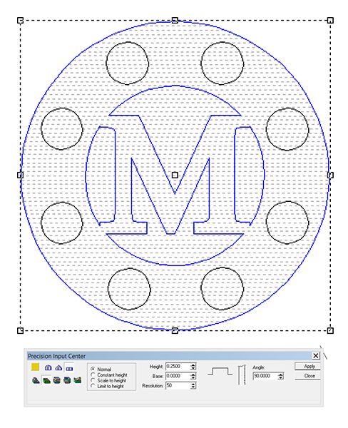 The riveted front motor housing was the first piece to be made it a relief. This was fairly straight forward. The file was built entirely in EnRoute. The inside and outside circle determined the dimensions of raised layer or outer ring. The intersecting lines would be the counterpoints for the rivets.