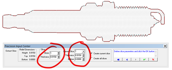 Since we need our slices to be 2″ thick I changed the thickness number to 2″ (on the left box) I also selected the CREATE ALL SLICES BOX.