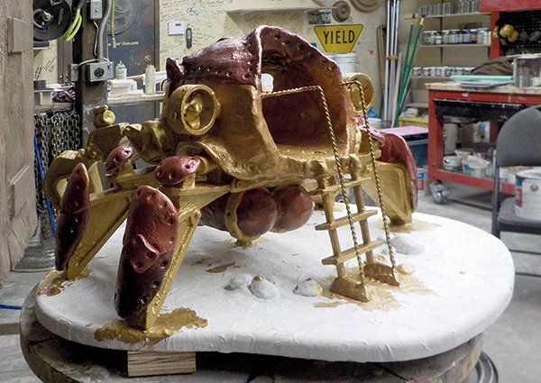 Painting the crab submersible was fun from beginning to end. I began with two coats base coats of gold. Then I did a blend coat with the gold on the bottom and a blend to a deep red on the top. The model instantly came to life.