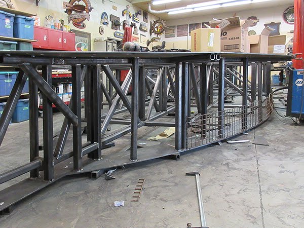 We then began welding up the floor section of the hull. It is essentially a giant truss. We will finish the ship frame to this degree before unbolting the six sections and taking them out of the shop. We will reassemble the piece outside in the parking lot before we build the sides and upper keels of the ship. It will all be test fitted before it gets disassembled once more to go to the galvanizers. When that is done we’ll reassemble the hull in two large sections for the concrete sculpture work. Two of these need to be built in the coming weeks.