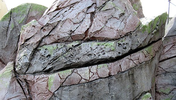 That meant we could apply the glazes today. The painting crew worked in teams, liberally applying the brown and dark grey glazes and then judiciously wiping them off. This process takes advantage of and highlights the textures and cracks. The plain grey instantly turned into believable rock.