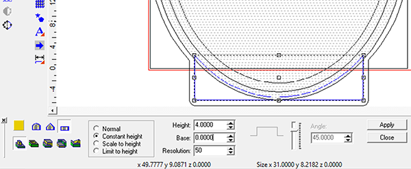 He then created a lower height relief around the oval which would effectively cut the shape out in a fashion. Our bit was only 2.5″ long so it wouldn’t cut all the way through but it would give us a guideline and a head start.