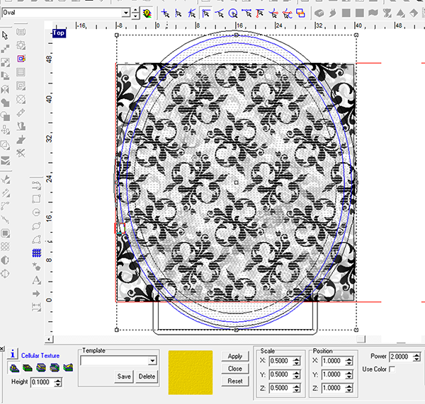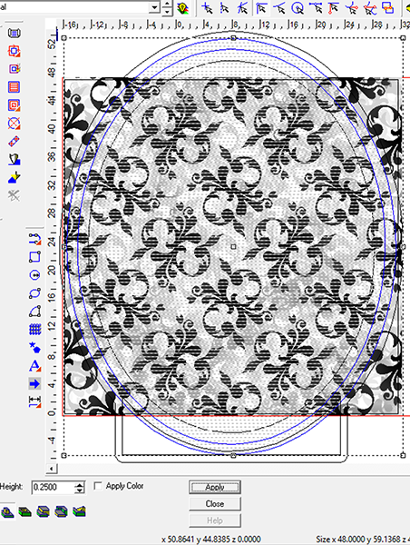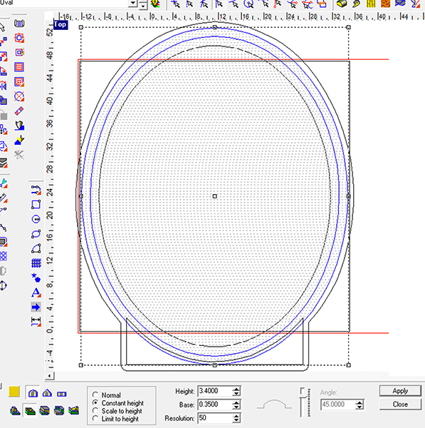 He then created a lower height relief around the oval which would effectively cut the shape out in a fashion. Our bit was only 2.5″ long so it wouldn’t cut all the way through but it would give us a guideline and a head start.