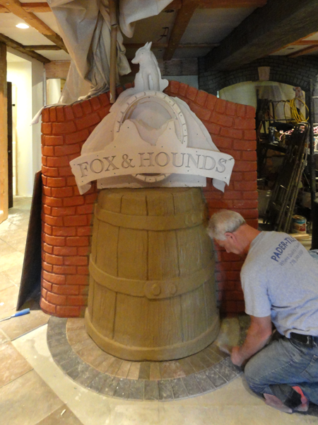 We are doing four versions and three sizes of the Fox & Hounds dimensional sign for various places in the project. Two are under way, while the last two await a sign permit. The smallest version of the sign is inside at the end of the entry. We test fit this sign in place, in order to build the barrel underneath. in this shot the tile man is fitting the border around the base. This sign will be returned to the studio shortly to be finished.