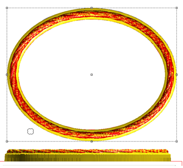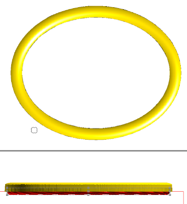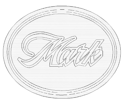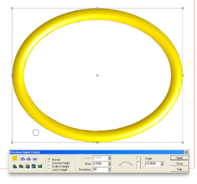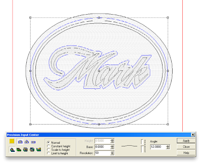 Next I created a flat relief of the lettering border. This was then modified with an oval vector using the same settings I had used for the oval background. Once modified I nudged it up into position in the front view. Then I modified the relief once more by adding to the relief with the letter vectors to create the prismatic chiseled letters.