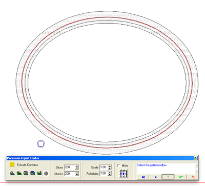 Then it was time to create the rope. I opened the extrude contours menu and then the various options. I wanted to create a mesh object. This will be turned into a relief later after it is in position. The slices and stacks determine how detailed your mesh will be. I tend to crank things way up but it makes for large files. Then I type in how many revolutions the rope will twist… this is a matter of trying a number and then doing it again with a different value if need be. Follow the steps in the menu to generate the mesh object.