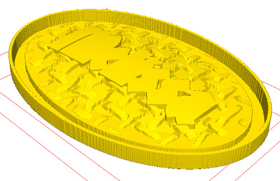 This relief was modified with an oval relief. I domed the letter outline relief using the same angle as the textured relief. This modified relief was then nudged into position in the front view.