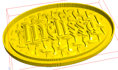 This relief was modified with an oval relief. I domed the letter outline relief using the same angle as the textured relief. This modified relief was then nudged into position in the front view.