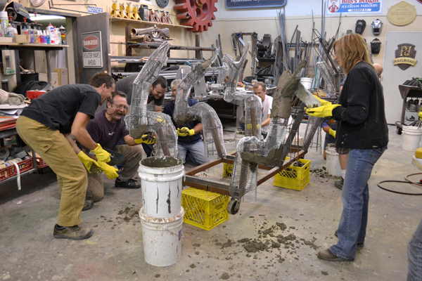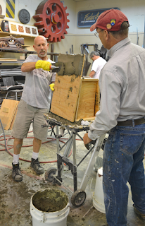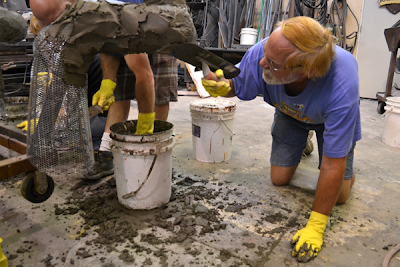 One of the many things we teach at our workshops is how we mix our special formulas of fiberglass reinforced concrete. It is designed and proven to trowel on easily and be super strong. It also carves easily – or at least much easier than regular concrete. Each student is allowed to try their hand at this task.