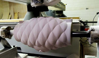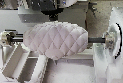 On Friday it was time to put our first real project on the four axis MultiCam and give it a whirl. IT would be the hot air balloon. We would cut it from a large block of 30 lb Precision Board measuring 14″ x 14″ x 20 ” long. We had previously drilled a hole in the center of each end and driven in a pipe. This would be our clamping point for the lathe. The routing operation would be in three phases. The first was the true lathe mode. Here we would assign a steady feed rate for the y axis. The z feed would be done in three passes as a straight line across the piece each time. The second operation was the roughing done in four passes. This was done with a half inch ball nose bit with a 50% overlap. The final operation was the cleanup pass done with a 3/8″ ball nose bit and a 95% overlap. A higher than typical overlap was necessary because the piece had a big diameter and the degree of rotation meant a greater distance corresponding to the distance from the centerline. Here’s a short video showing the various passes…