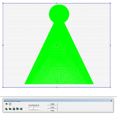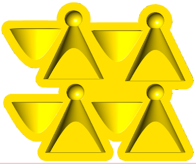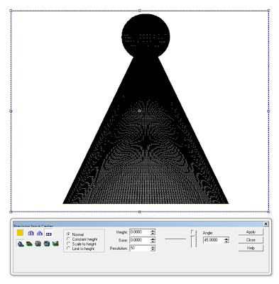 For the nose cones of the ballon I decided to use the 3 axis part of the router. It was a quicker way of doing things in this case. I first measured up the balloon to determine the angle and size of the nose cone, then began building the file in EnRoute. I would use the revolve tool to build a mesh and then convert this to a relief. The red lines below show how I lined things up to a box of known dimensions.