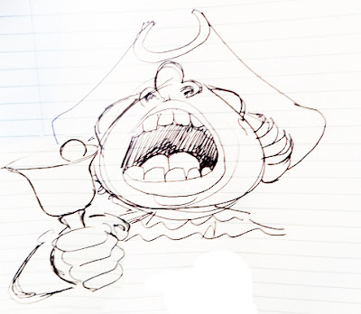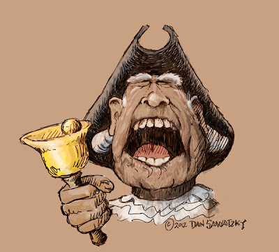I pulled it into PhotoShop and cut, pasted, morphed, stretched and tweaked until I had what I wanted. I then redrew the town crier adding a hand with a bell, a tricorne hat, a powdered wig and a ruffled shirt. It made me laugh while I covered my ears. This guy is obviously LOUD!