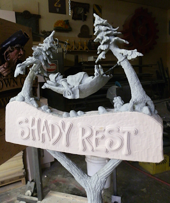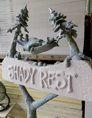 Today, I finished the sculpting on the Shady Rest sign. It was fun to add all the small details such as his wiggly toes, his big belly and the had pulled down low over his eyes. This guy is out for the count. A bunny sneaks up below – not worried by the fellow sleeping overhead.