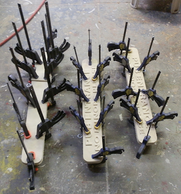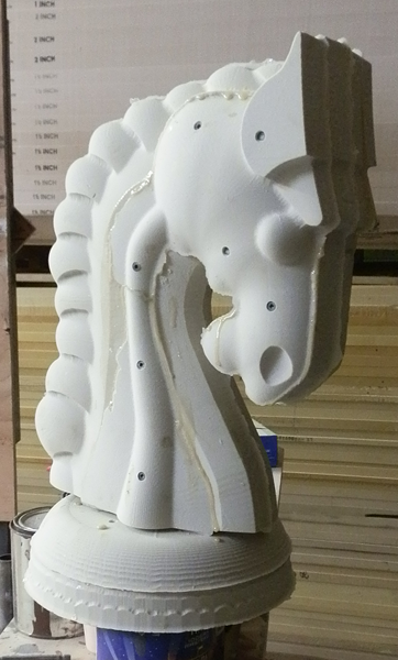 Once they were off the router it was time to kick the Lark Rise sign into gear. The horse’s head was the first task. It was routed in four layers of 1.5″ thick 30lb Precision Board. I then glued it up in readiness for some quick hand carving. If we were doing multiples it would have made sense to spend more time on the modeling and add more fine detail. But I would rather spend my time doing this work by hand – after allowing the machine to do the hard work – roughing things out. The horse’s head is about 16″ tall and 6″ thick as a point of reference. Once I have flattened the bottom of the neck it will be fastened to the round base below.