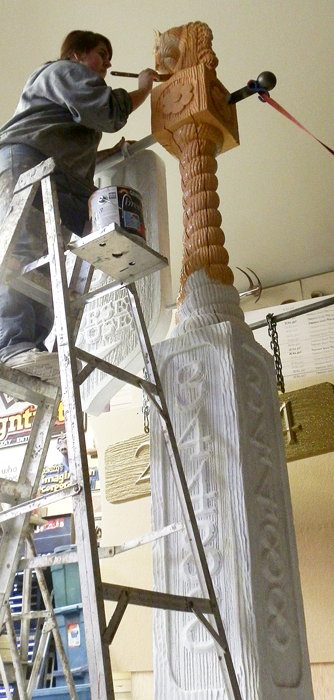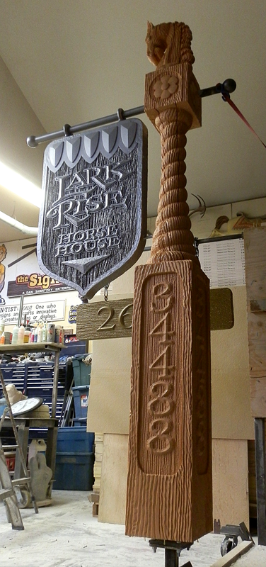 With the carving and sculpting now done it is time to kick off the painting process. First the usual coat of FSC 88-WB primer from Coastal Enterprises. This smoothes things out a little and also is used to apply a subtle texture to the lettering by using a small brush on those areas. We set up a shop fan for a few hours to suck out the moisture. Then it was time to apply the first coat of acrylic paint. The post got an even coat of light brown acrylic house paint. It will be allowed to dry overnight and then it will get a second coat.