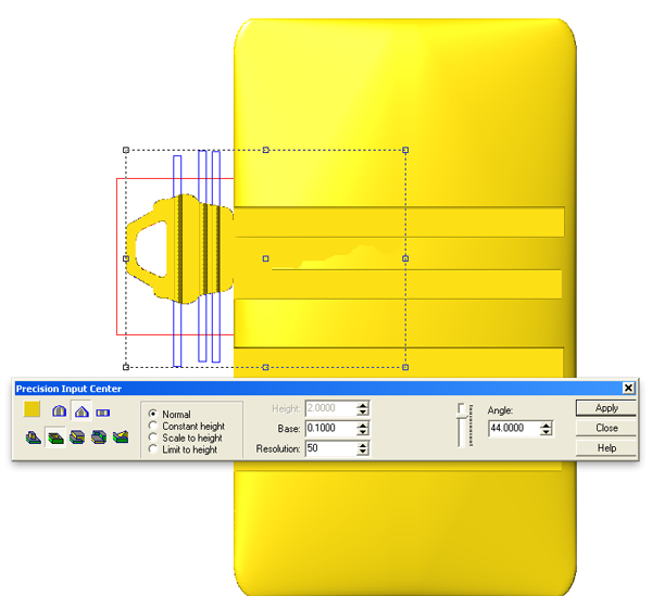 The first relief I created was for the key ways. I would model the key at two inches thick and thin it down later. Since I wanted the key way to go half way into the key it needed to be one inch deep and ramp up at the end. By using the scale to height on the rounded relief I could control this. Take note I used the subtract from relief command to make it go down.