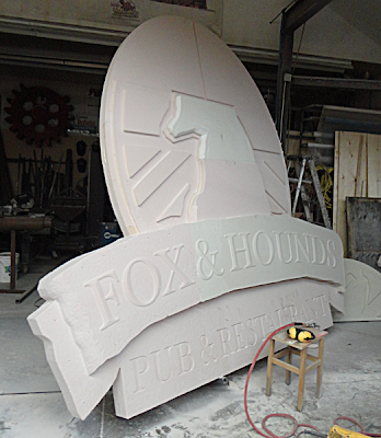 As big as the sign looked as we began to assemble it, it only looks larger with each additional piece. We are working on the lower portions of the sign to start. The bulk of the work at this point is to take care of the glue joints, even things out and add the texture I desire on the face of the sign. Once that is done we’ll finish up the top bits and then start in on the fox head sculpt. Then we’ll work our way down with the paint.