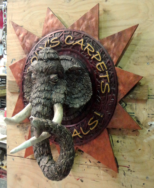 This sign was a whole lot of fun to do from the first inkling until it’s finish. Today the ladies put on the final glazes and then painted the lettering. Wooly is going to be a playful addition to our shop display. The sign measures 33″ wide by 36″ tall by 20″ from the wall to the tip of Wooly’s trunk. THAT is a dimensional sign!