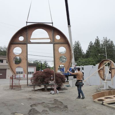 Today was an exciting day as we ‘flew’ the pieces into place. My friend John Wishlow brought his crane to our project and lifted the heavy pieces into place. Two 13 foot windows, one on the front and one in the rear of the house were lifted and fit into place.