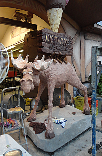 With the installation of the moose happening early tomorrow morning we simply had to finish it tonight. Generally I like to finish well before deadlines but this has been an incredibly crazy week. We worked until just before 10 pm tonight to get the last of the paint on the mighty moose. Because it was too tall to finish inside the shop we completed it under the outside porch. High humidity and steady rain made the paint dry extra slow. ten high powered fans aimed at the moose took care of that problem in a hurry!