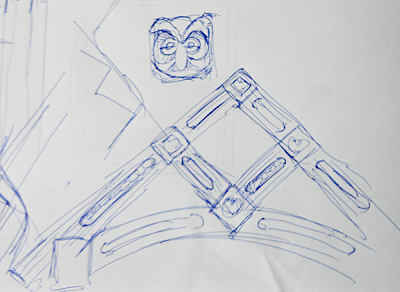 A quick scribble was the first step – just to make sure Janis & I were in agreement on the rough concept. No problem there. The owl was an idea I threw in for the end of the beams. It was decided things were busy enough without adding another element to the mix.