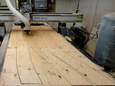 It isn’t often in our shop that we use our router as a jigsaw or cut plywood rather than Precision Board, but when we do it churns out a mountain of parts in a hurry. Today we were cutting curved headers, eyebrows and beams. We whipped through a pallet of 3/4 plywood in no time. Now comes the arduous task of putting the many pieces together! The router room is in desperate need of cleaning too when we get a spare minute.