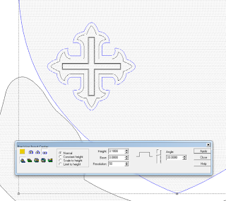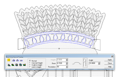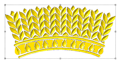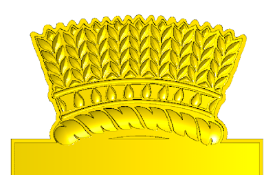 I forgot to grab a screen shot of the next step but I selected the top wheat shapes. I used the prism tool to make the reliefs. The drops and the bars of the crown were next. These elements were domed with a base of 0.15 inches.