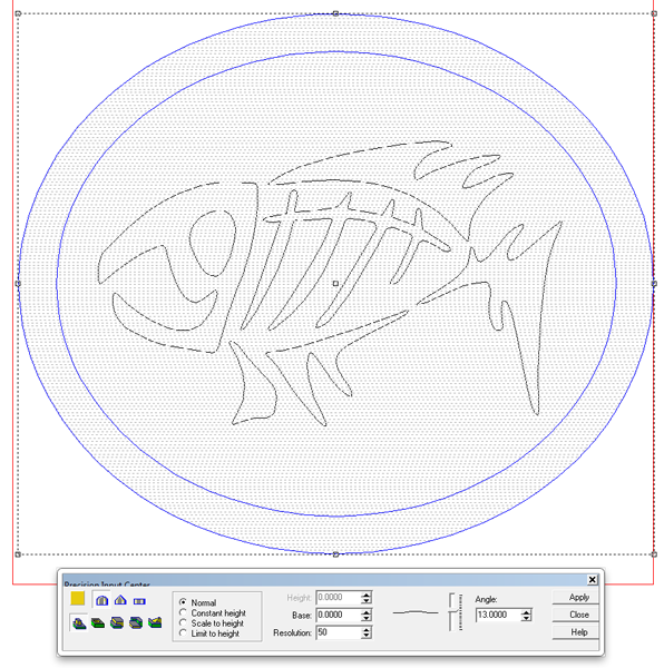But I waned more. The fish really came alive yesterday when we domed the top of our relief. To dome it only inside the center oval I selected the base relief and then the modifying vector. This would dome the center portion of the oval only. Once again as I clicked the apply button nothing seemed to happen in the top view.