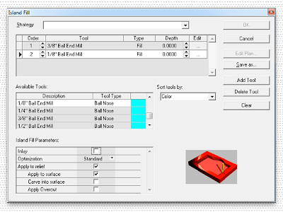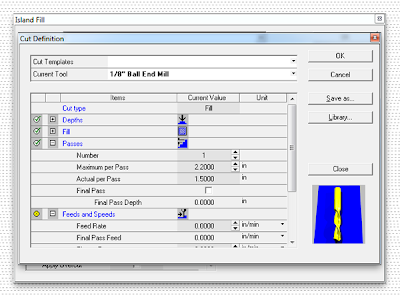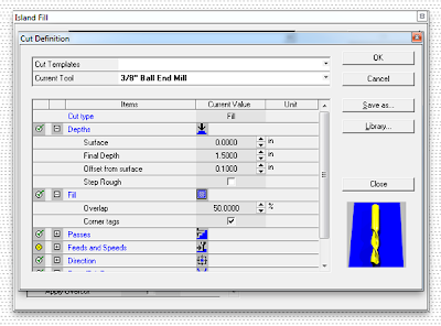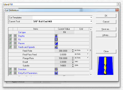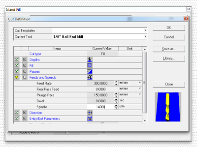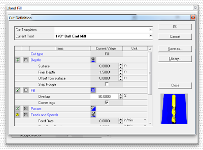 I opened the island fill window. I have found that by using the island fill on these kinds of too patching I break fewer bits. This means the cuts start in the center of the piece and work outwards to the edge. I selected the 3/8″ ball nose bit first and then the 1/8″ ball nose bit. The 1/8″ bit I use is a tapered bit (1/4″ shaft down to 1/8″ at the tip) it has a cutting edge that is 1.5″ long.