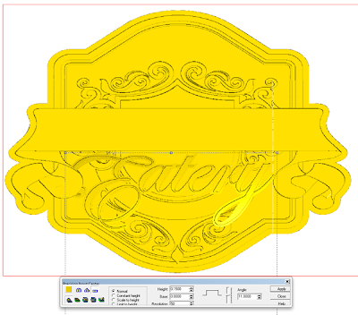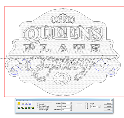 Once I had the flat relief I then modified he relief by selecting both it and the oval vector I had created previously. A 12 degree slope on the curve also proved to be the magic number in clearing the center shield and sloping down enough on the edges to tuck under the scroll folds. It took me three tries to figure this out. Once I had the lettering background right I added the lettering to this relief.by raising it 0.15″ (not shown)