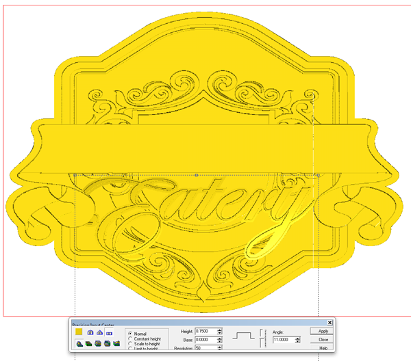 Once I had the flat relief I then modified he relief by selecting both it and the oval vector I had created previously. A 12 degree slope on the curve also proved to be the magic number in clearing the center shield and sloping down enough on the edges to tuck under the scroll folds. It took me three tries to figure this out. Once I had the lettering background right I added the lettering to this relief.by raising it 0.15″ (not shown)