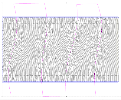 For the wainscot paneling in our new house we are using Rapid Texture. This feature in EnRoute uses the profile of a (large) bit to create the texture by following vector lines generated by EnRoute. The user first creates seed contours. Then by setting adjusting various perimeters (length, amptitude, jitter etc) the lines can be adjusted in controlled or random ways that effect the texture of the final panel. Panels are generated in mere minutes instead of many hours. The vectors are bent, both vertically and horizontally to create patterns for the tool path and resulting textures.