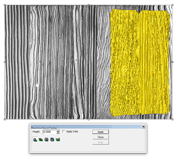 I applied the bitmap to the relief at 0.2″. This meant the black of the bitmap did nothing while the white areas were raised 0.2″ the grays were raised something in between depending on their value.