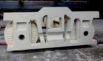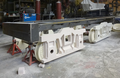While I was in town shopping the MultiCam was busy carving the truck sides that would cradle the wheels and ‘support’ the train. They were whittled from two inch thick 30 lb Precision Board. The pieces that will be fastened on to provide all the detail will be routed tomorrow.