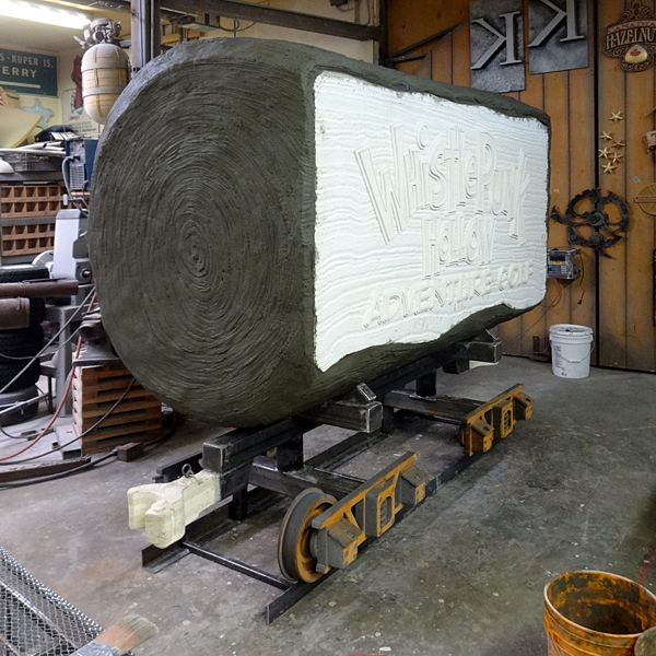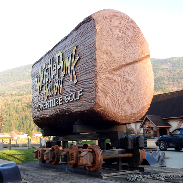 I posted pictures and a small writeup of the log car that would accompany the steam locomotive on the Whistle Punk Hollow Adventure Golf project. That article covered creating and routing the face of the log which would act as a giant sign. Around that we welded up a framework of quarter inch thick steel bar, then attached expanded lath to that framework. Over this we troweled on a thick coat of fibreglass reinforced concrete and then as it dried carved in the woodgrain and bark textures. This was allowed to cure for a few days.