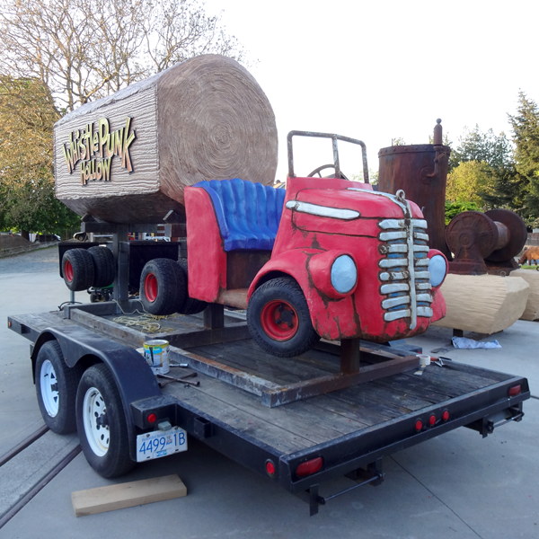 The Shay Steam train at WhistlePunk Hollow has a companion piece as well. For the seventh hole feature we sculpted a logging truck. Like the log car on the locomotive we fashioned the sign face on our MultiCam with 30 lb Precision Board. The file was created in EnRoute in the very same way as the logging railroad car. This time the wording was a little simpler (no adventure golf) as it is a secondary sign. The balance of the truck was created from welded steel and fiberglass reinforced concrete.